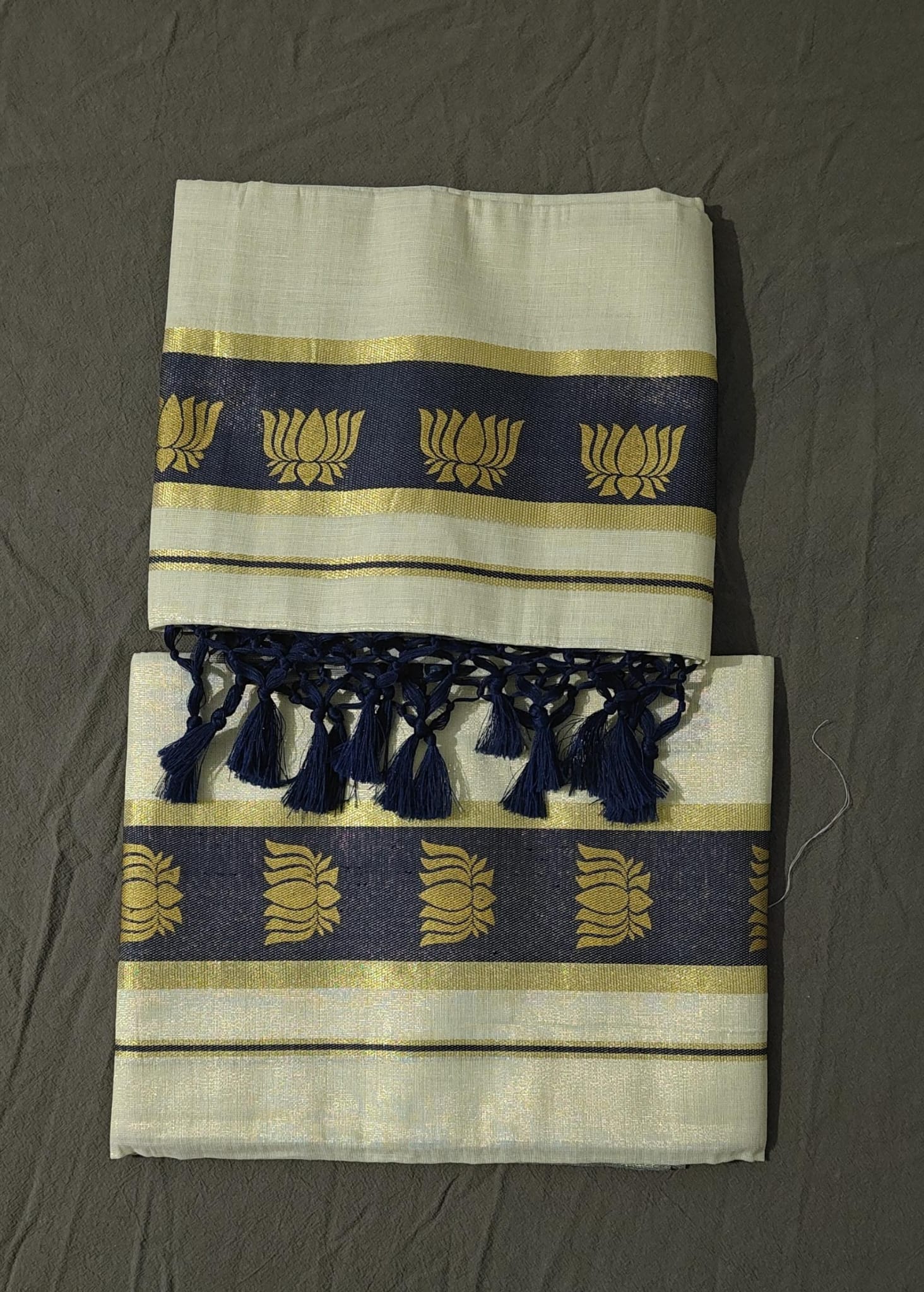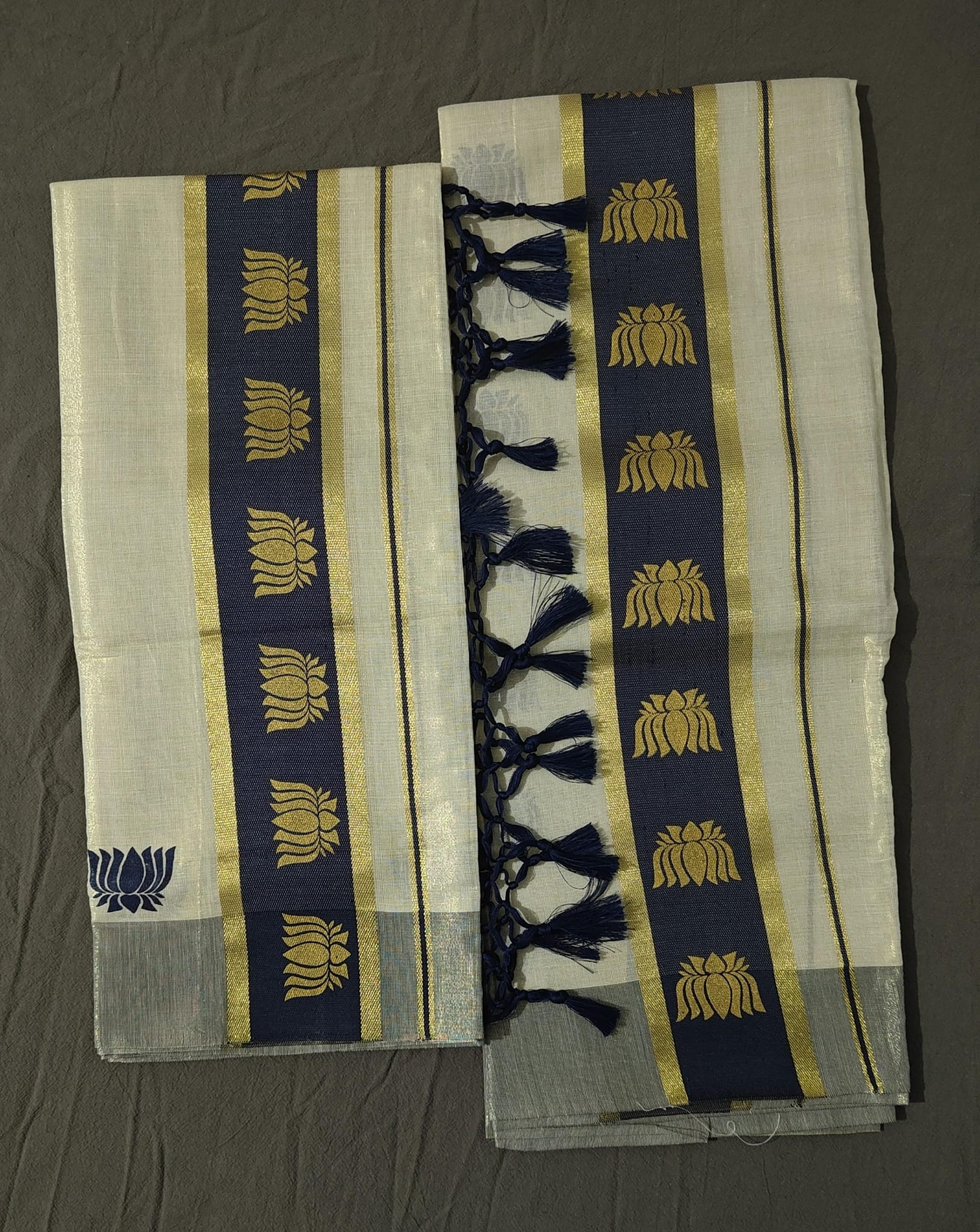 Set Mundu Navi Blue Lotus Golden with Treaded Pallu 3.5 Inch Kasavu
