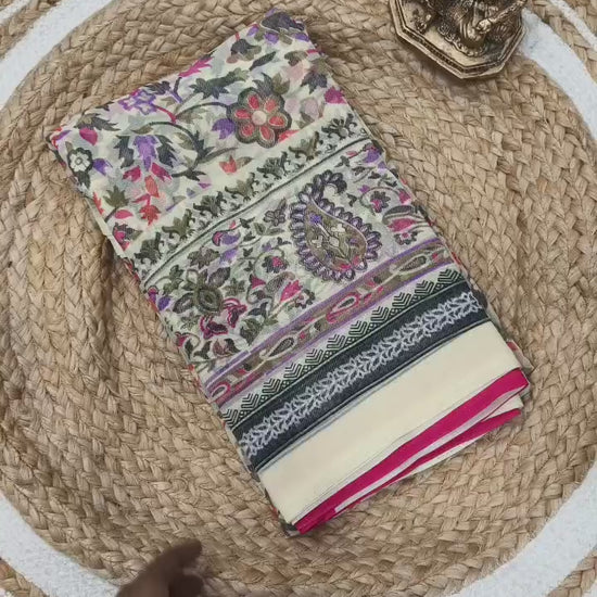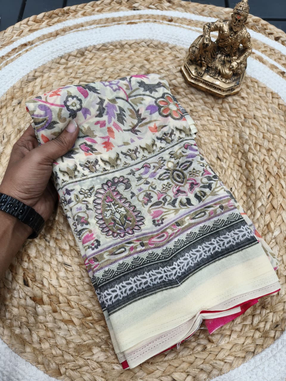 The highlight of this saree is the all-over Ajrakh print, showcasing intricate patterns inspired by traditional hand-block designs. It comes with a perfectly matched blouse piece and pallu, ensuring a complete and graceful look.