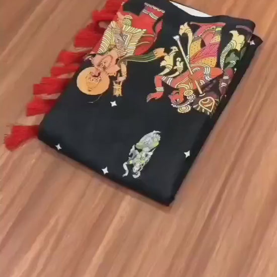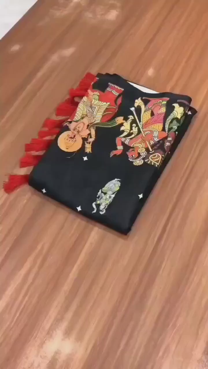 - Design: Black saree with Kalamkari prints & tassels on pallu