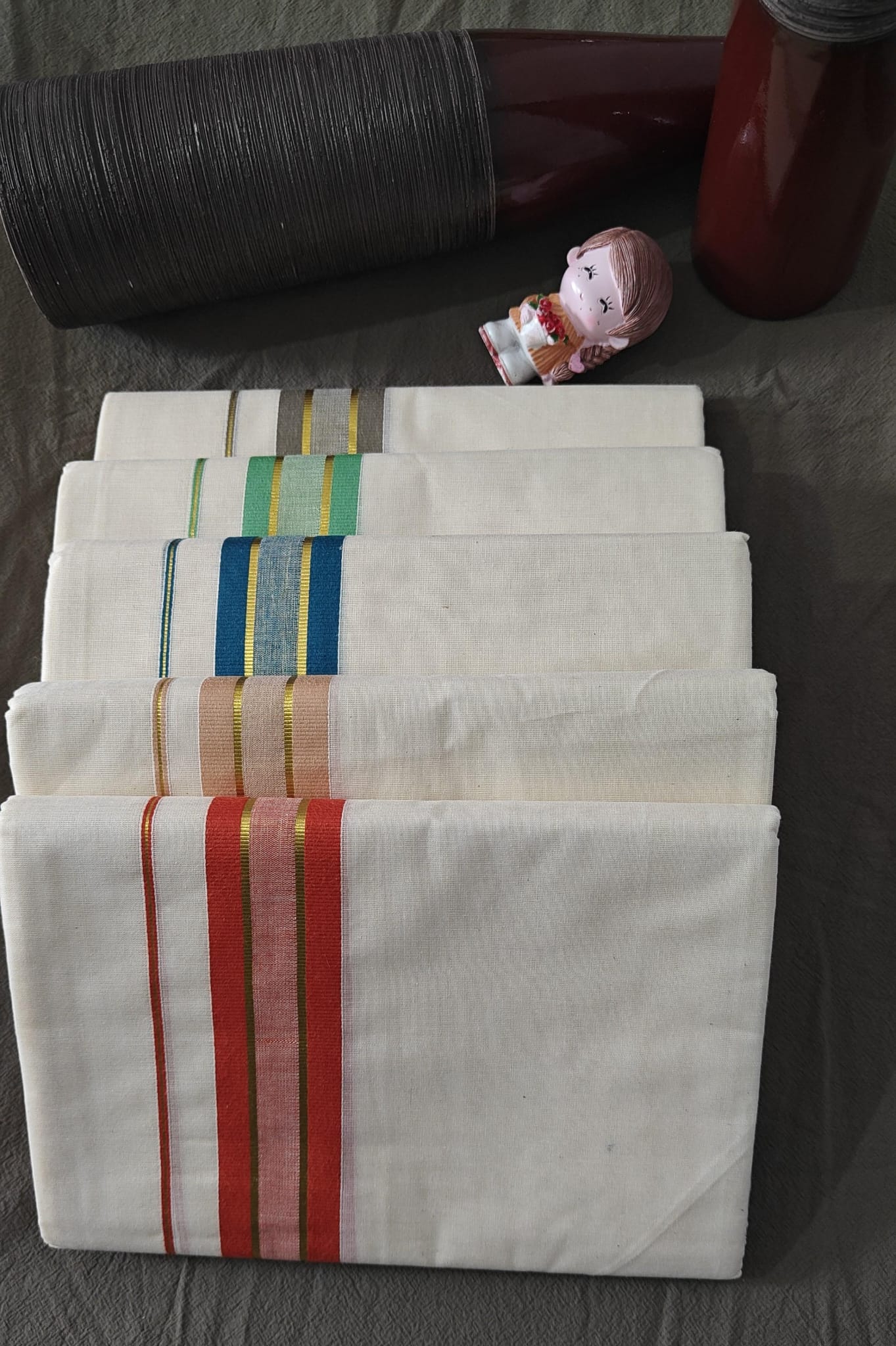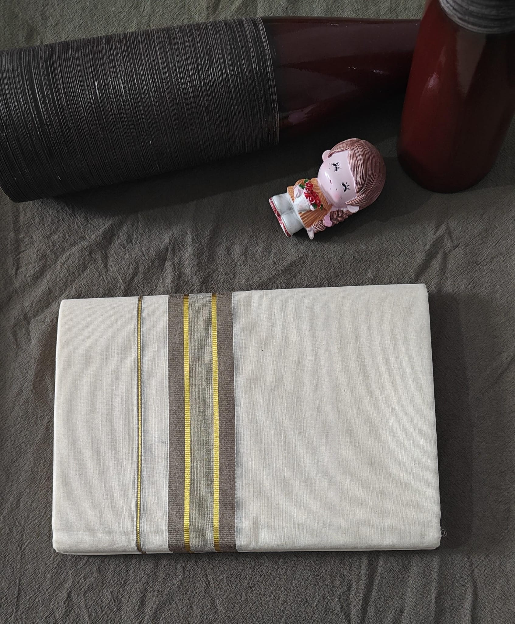 Add a touch of earthy elegance to your traditional attire with this Classic Double Dhoti, featuring a sophisticated brown and golden border. Expertly woven from premium-quality cotton, it offers a soft texture, breathable comfort, and an authentic Kerala look—perfect for festivals, temple visits, and formal cultural events.