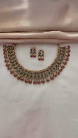 Add a little sparkle of tradition to your style with this graceful Golden Neck Set, beautifully paired with matching earrings. Designed with rich green and red accents, this piece captures the charm of heritage-inspired artistry while bringing in a touch of modern elegance. The earrings complete the look, giving you a set that feels truly special.