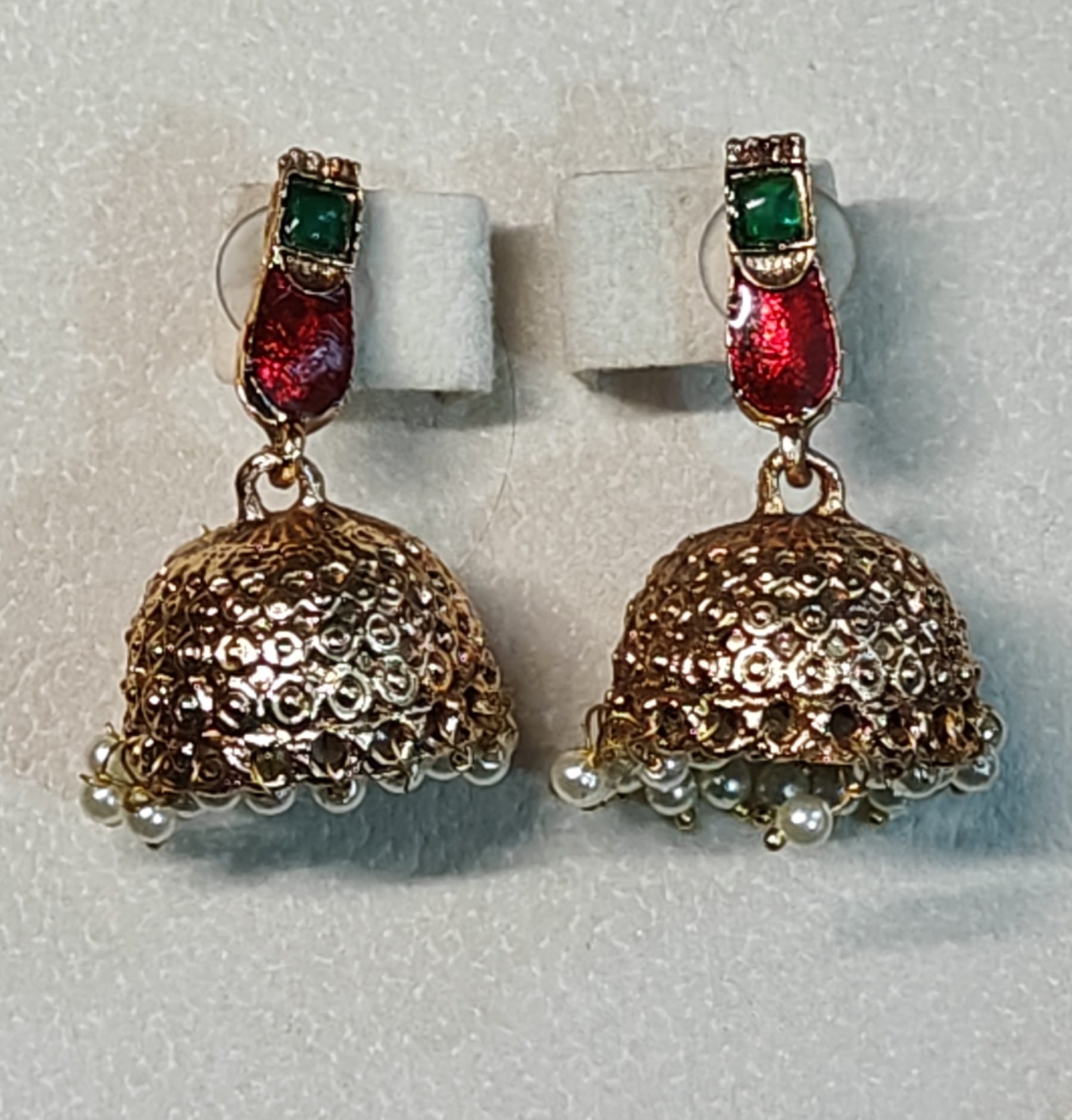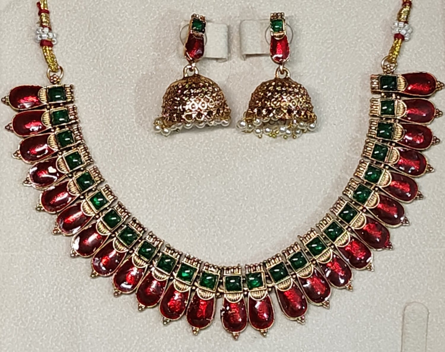 Bring a touch of tradition and elegance to your collection with the Kovai Neck Set – Red with Green Design. Beautifully finished in a soft matte gold, this set is adorned with vibrant red and green detailing that adds a rich, festive charm.