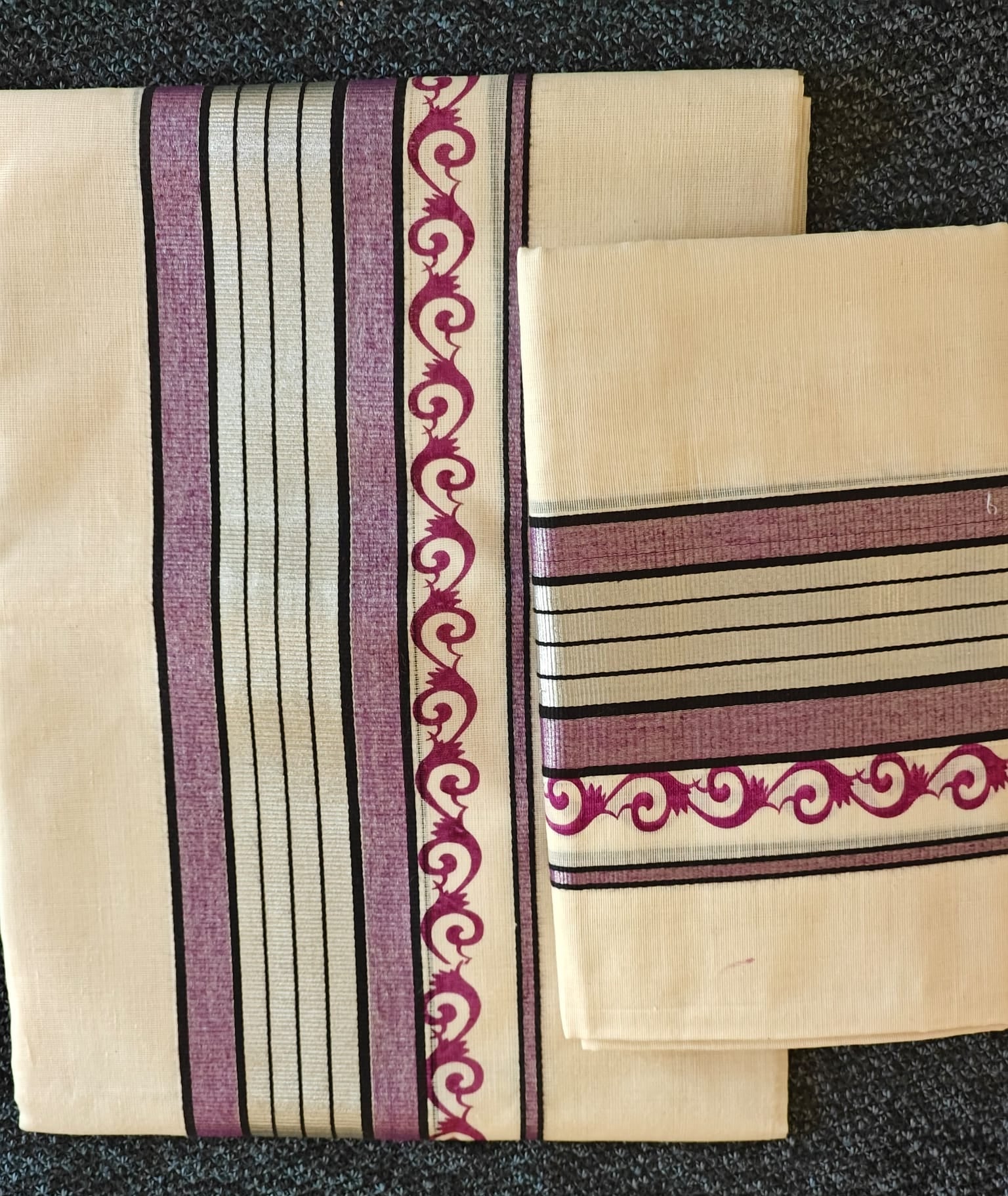 This traditional Kerala Set Mundu features a purple and silver line pallu with a 3-inch kasavu border, giving it a refined and classic appearance. Made from 100% pure cotton, it ensures both comfort and durability, making it suitable for long hours of wear.