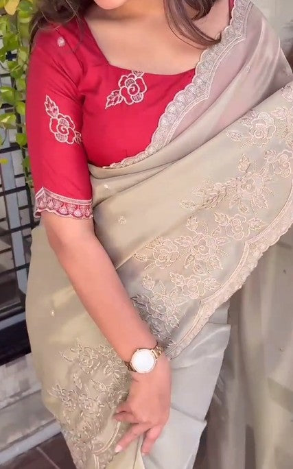 • Rich thread embroidery beautifully spread across the saree