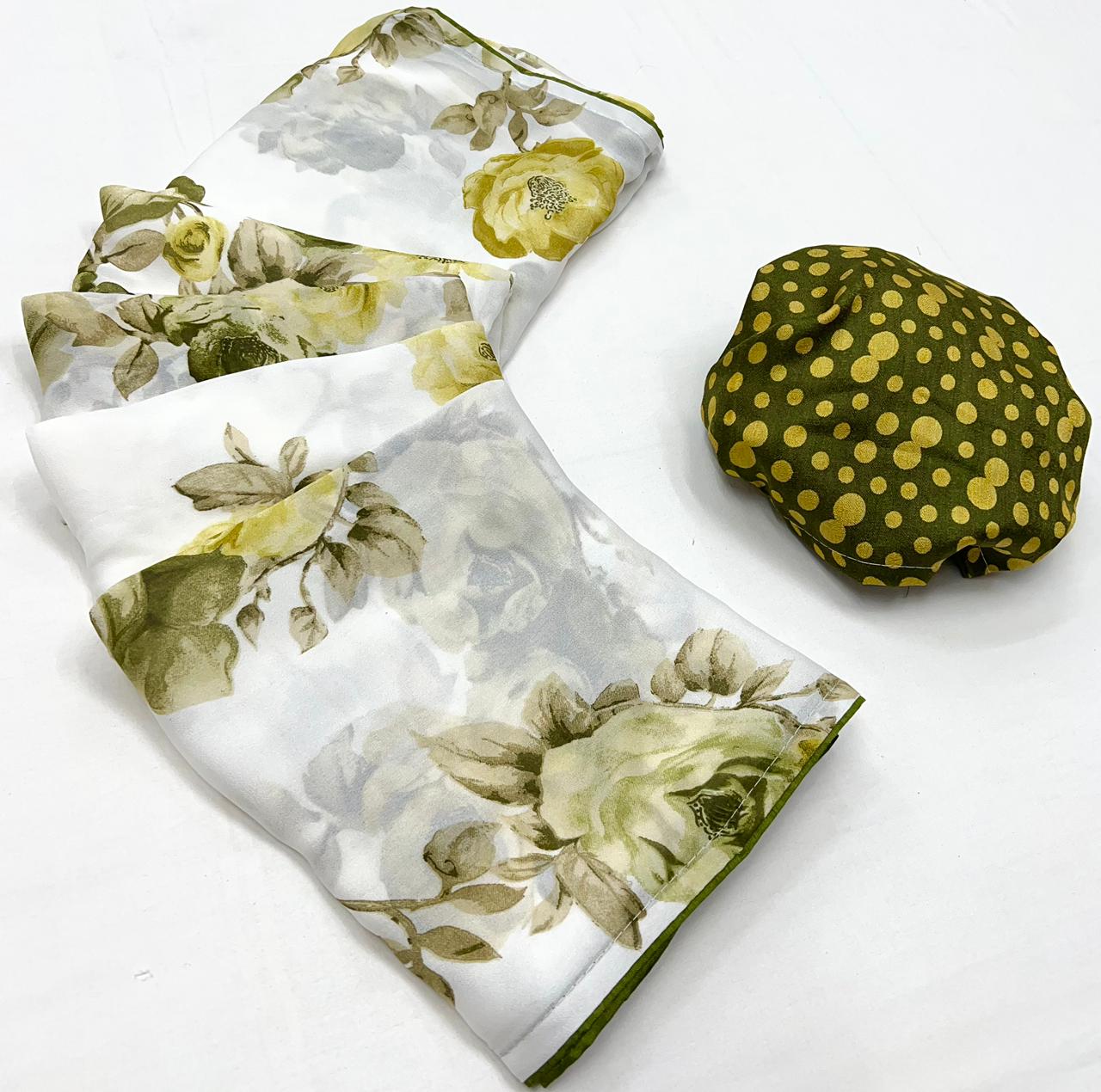 Celebrate in style with our white and yellow flower georgette saree, crafted from heavy embose georgette fabric. The saree is adorned with a floral digital print and enhanced with a brasso effect all over, giving it a rich and festive appeal.